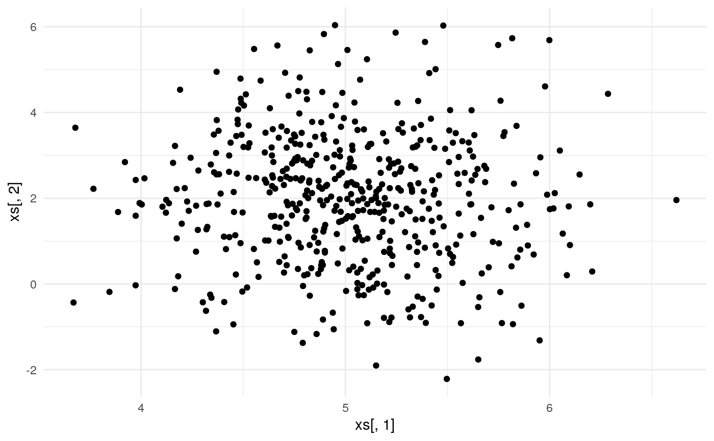 theme_set(theme_minimal())This example is taken from a blog post that I wrote on Hamiltonian Monte Carlo. See that post for details of deriving the un-normalised log-posterior and gradients. I also compare the efficiency of HMC and the random-walk Metropolis algorithm by comparing the effective sample size per second.