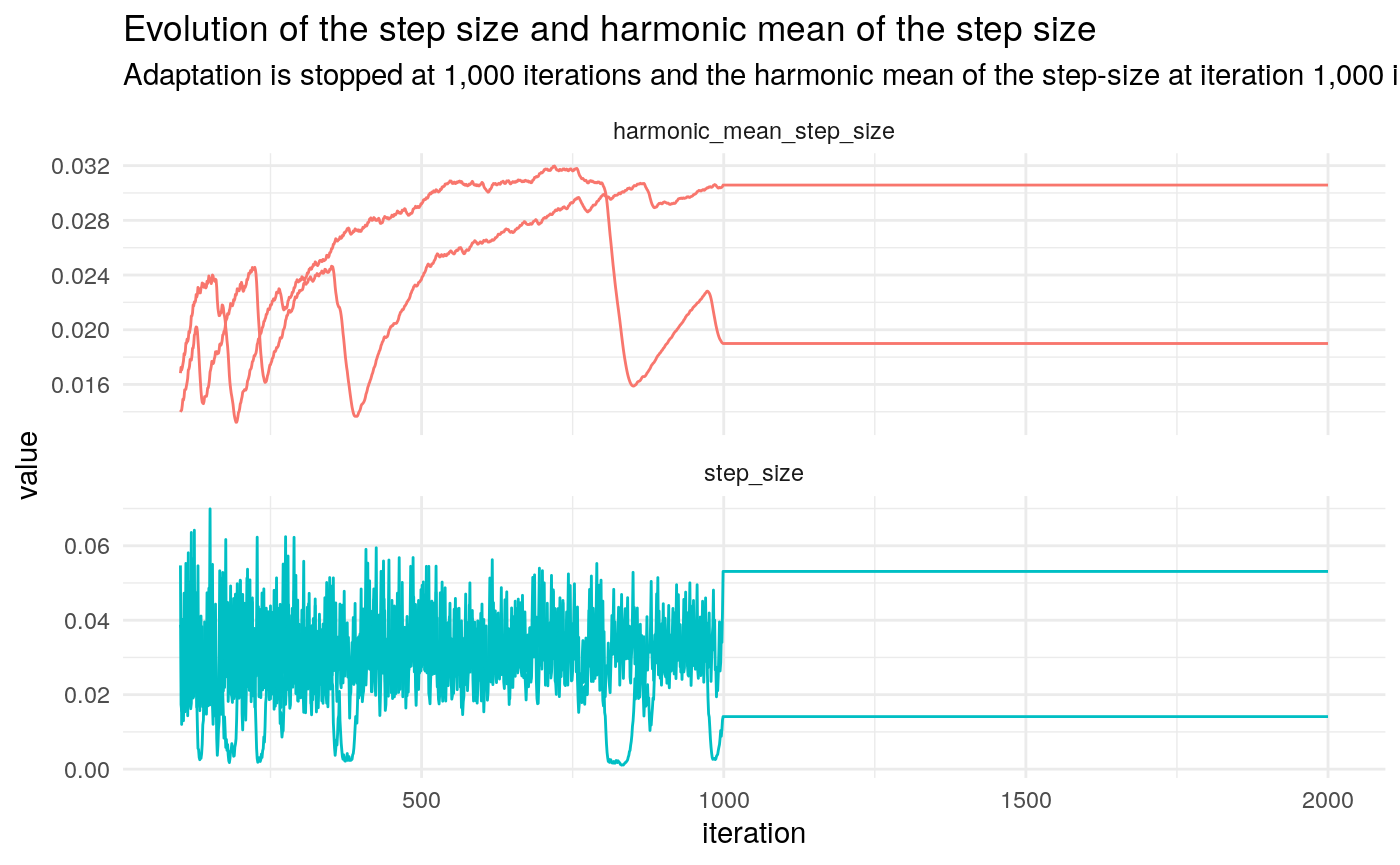 labs(title = "Evolution of the step size and harmonic mean of the step size",
